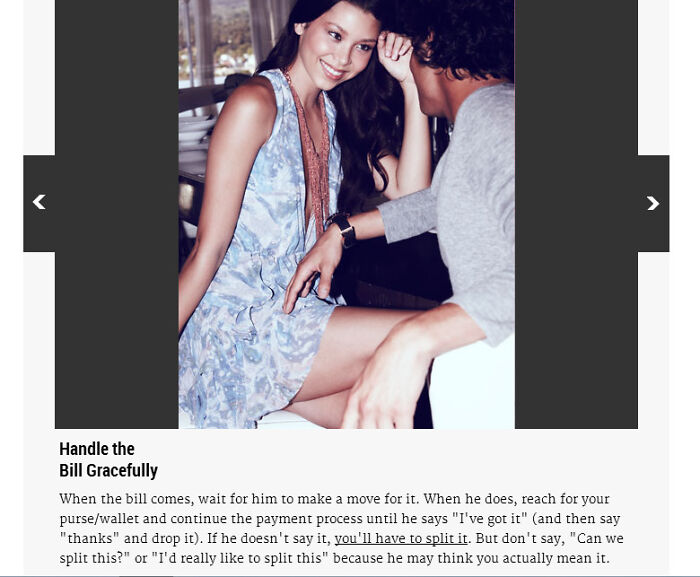 If you’re in a happy, healthy and committed relationship, you might be shocked to find out that this kind of advice is actually being published by people who are getting paid. But, on the other hand, if you’ve ever been on a terrible date (which, let’s face it: we all have!), you might not be so surprised. Perhaps someone you met on Tinder and ended up having dinner with learned that it might be a good idea to start touching your feet under the table or ordering for you from one of these questionable publications.
