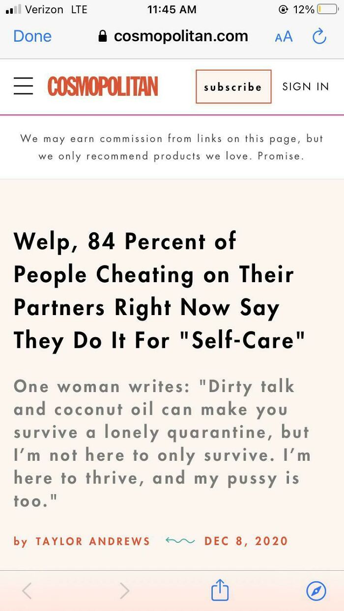 However, lucky for those of us who are actually sane, we have the [Stuff] Cosmo Says subreddit to laugh at “all the worst from the world's most dangerous sex and relationship advice.” This community, which has been around for a decade now, is primarily focused on sharing questionable advice that’s been published in Cosmopolitan magazine, but they don’t discriminate. “We will welcome bad advice from anywhere,” the mods write in the group’s About Community.